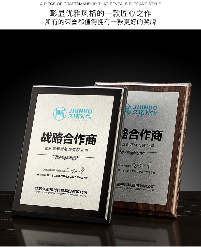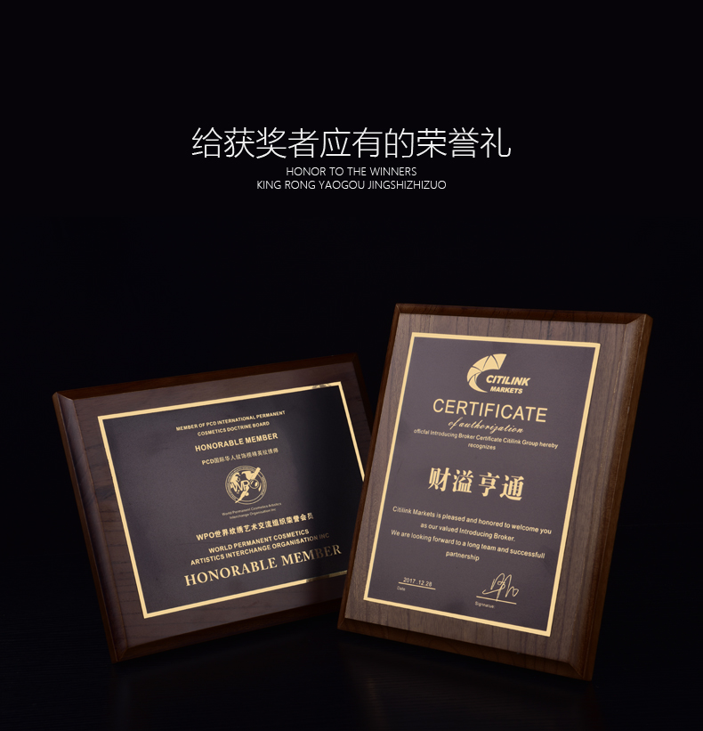 510 / 胡桃授权牌定制奖牌挂牌金箔荣誉牌匾亚克力铜牌水晶奖杯证书定做