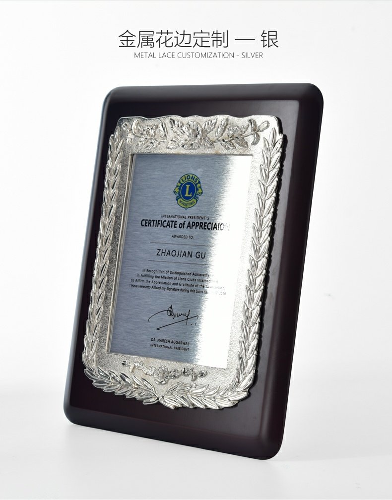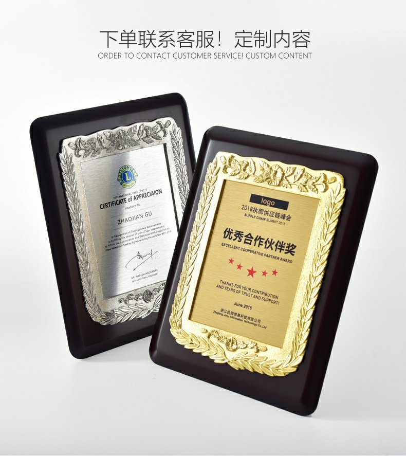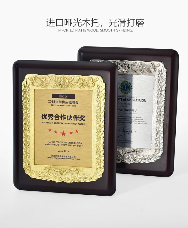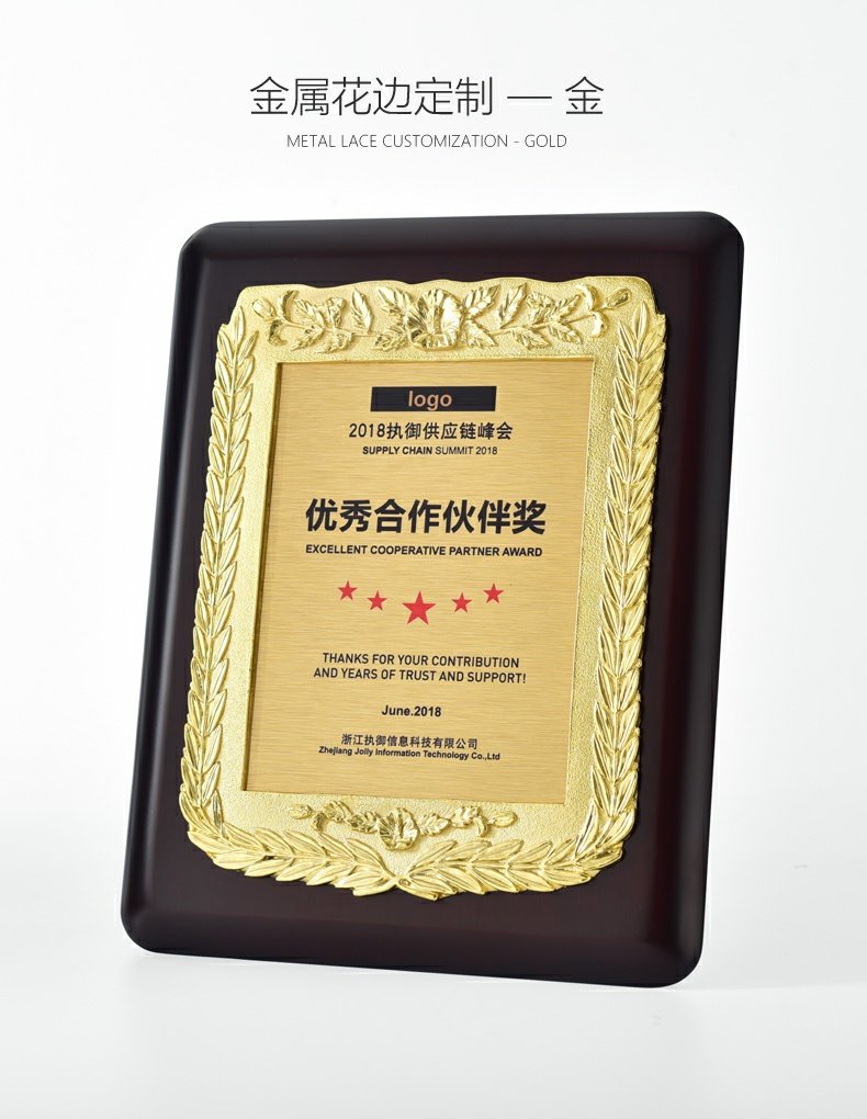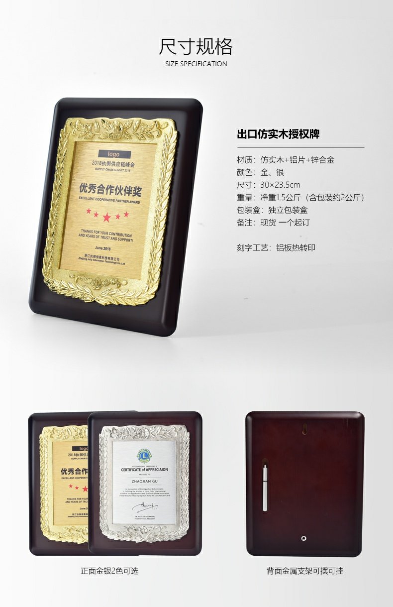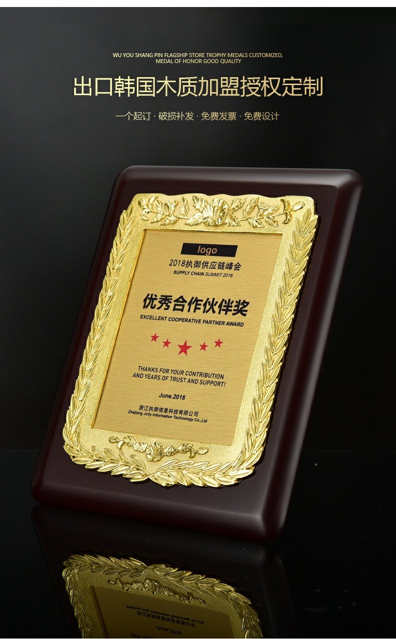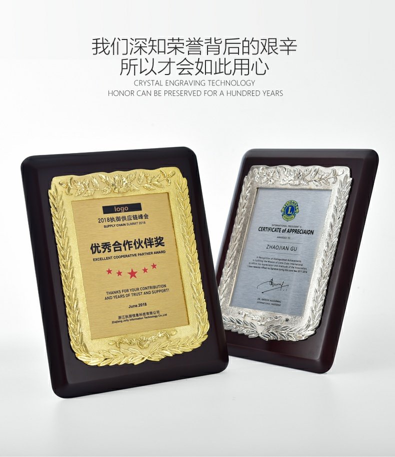 543 / 金属花框奖牌高档牌匾仿胡桃木花框奖牌木托牌制作授权牌定制代理牌荣誉牌证书