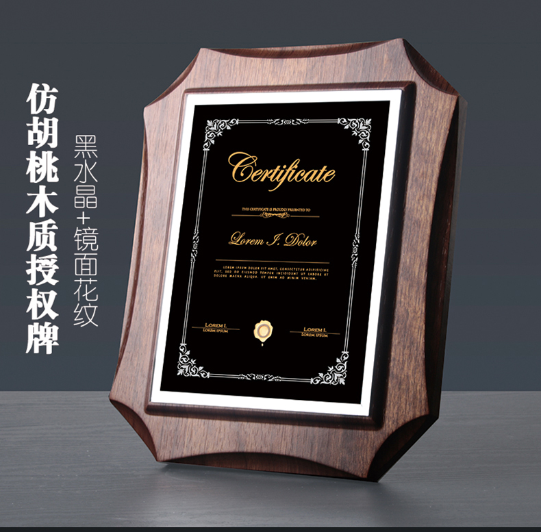 524 / 高档仿胡桃木奖牌定制定做企业公司品牌授权牌优秀员工水晶彩印牌